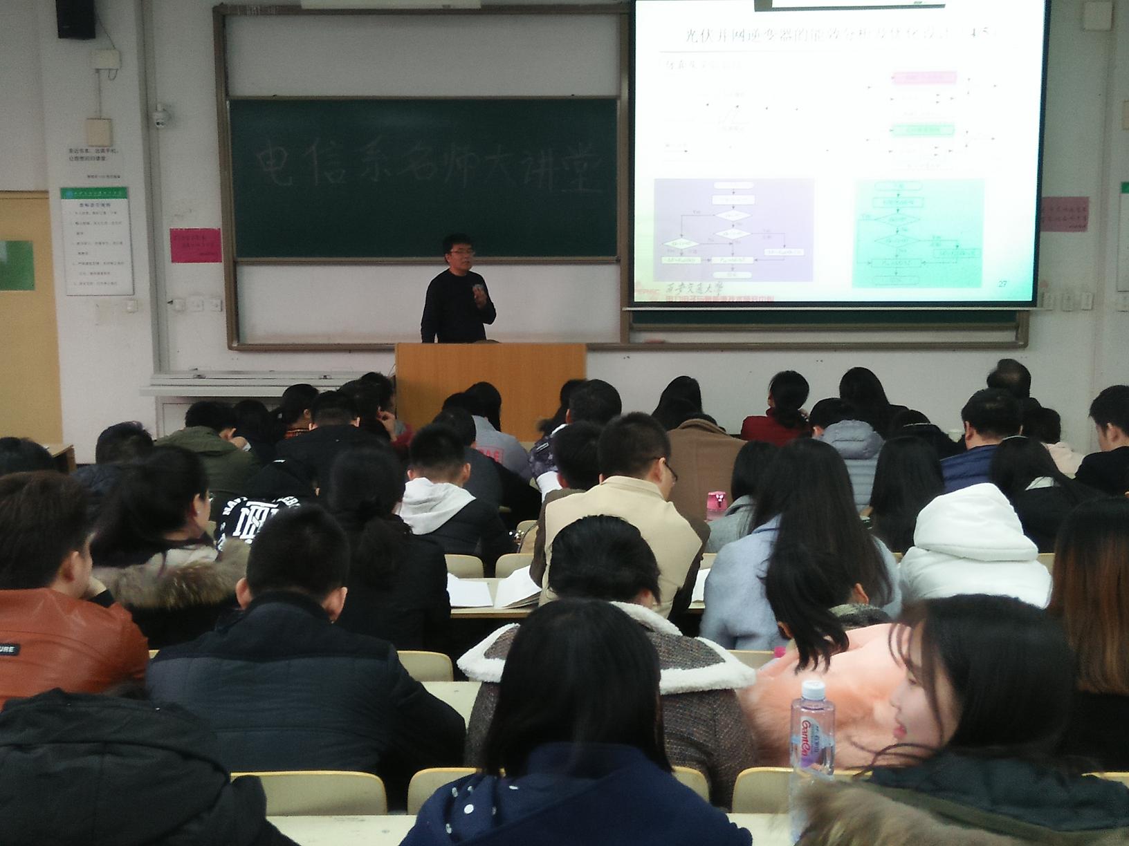 首先,卓放老师从专业的角度讲解了光伏发电的研究背景,研究现状和光伏系统的特点,卓老师演讲中散发出的学者风范及深入浅出的讲解,都极大的提升了学生们对于光伏产业的兴趣。接着,卓放老师分别就光伏组件的能效影响机理及优化策略、光伏电站直流汇集系统损耗分析及能效优化等方面的知识做了细致入微的讲解。在讲解的过程中,卓老师独具风格的讲座技巧、清晰有序的讲解思路,都令在场学生深深折服。最后卓放老师希望同学们能够发扬创新精神,将课本上的理论知识同实践紧密结合在一起,全面提升个人能力。