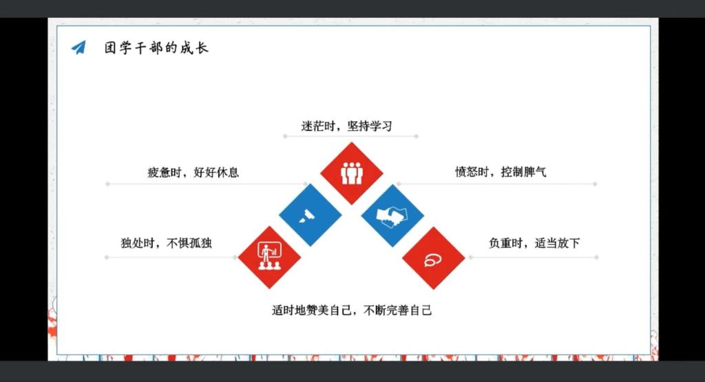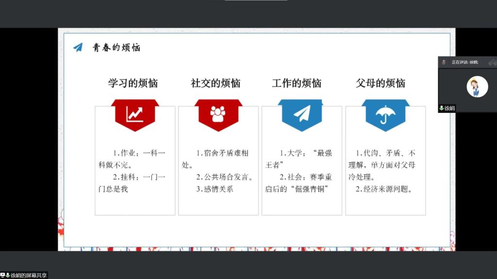 与其说青春是一种年龄阶段,不如说青春是一种拼搏奋进、勇于担当的精神状态。对于奋斗不息、心怀使命的人来说,青春从未流逝。徐娟老师围绕“自信的青春”“烦恼的青春”“烦恼促成长”及“热爱有光”四个板块,利用名人事迹,名言警句,小故事等结合学生日常学习、生活、工作进行分析,激发青马学员对人生未来之路的思考并引导鼓励同学们永远不要怀疑努力奋斗的意义,找准热爱点,创造属于自己的“人生归宿”。