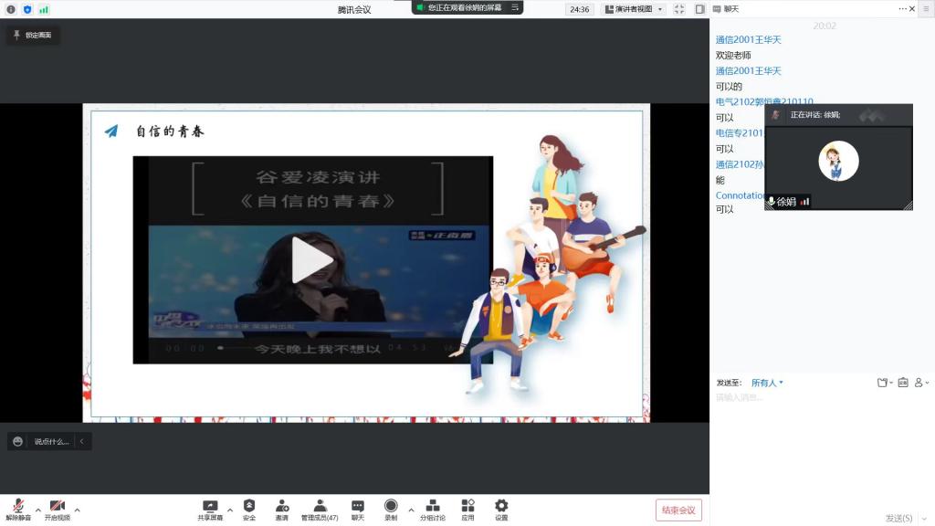 为了引导青年大学生树立正确的人生观、价值观和奋斗观,端正学习、生活、工作的态度并以一种昂扬的姿态向前奔赴,电信系于6月16日通过腾讯会议线上举办了题为“愿青春走在你的热爱里”青马工程大学生骨干培训班第三讲,本次授课的主讲人为电信系团工委书记徐娟,主持人汤天坤。