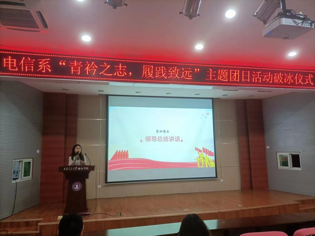 大会尾声,电信系主任助理王姣总结发言,以“青衿之志,履践致远”的含义谈起,希望各团支部认真领悟主题内涵,认真开展活动代领各团支部成员胸怀大志,脚踏实地,在青春的赛道上奋力奔跑出属于自己的新征程。