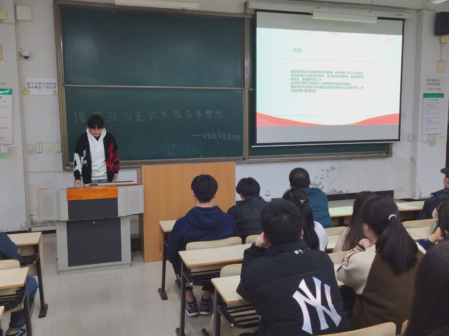 随后,赵佳艺同志从“如何建强党员队伍”出发,带领党员学习了《中国共产党党员教育管理工作条例》,并阐述自己的看法。加强党员教育管理是党建设的基础性、根本性、经常性任务。全体学生党员要学习掌握《中国共产党党员教育管理工作条例》的各项要求,切实增强“四个意识”、自觉践行“两个维护”,在日常的学习工作中充分发挥党员先锋模范作用。