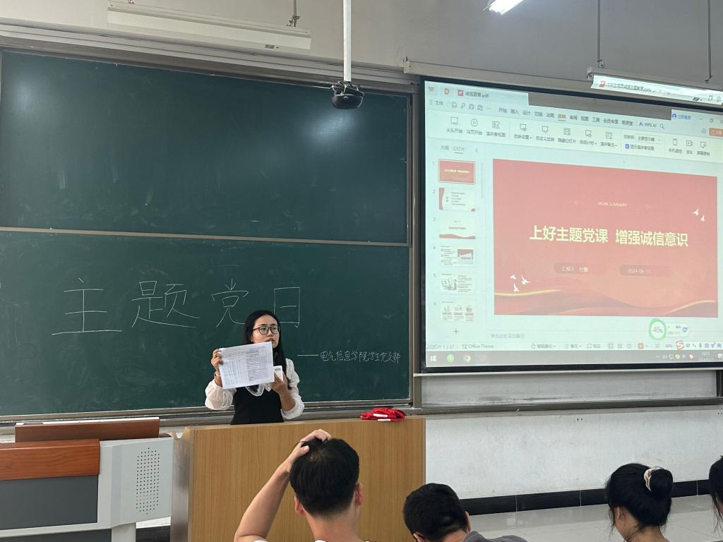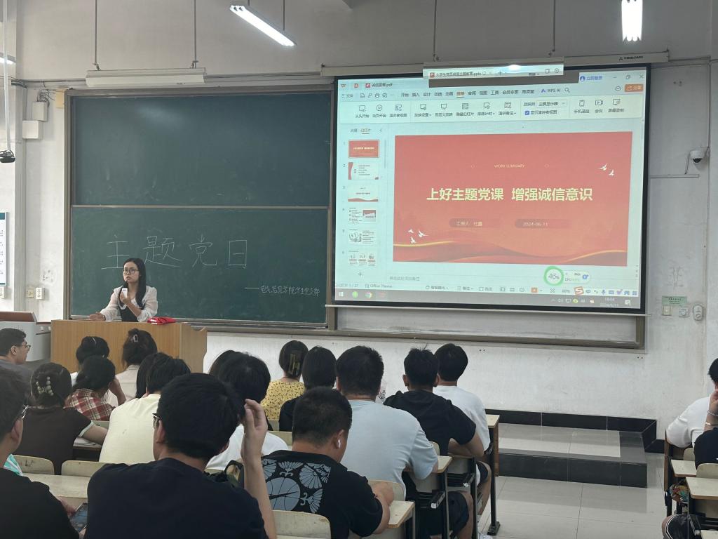 活动当日,久久精品亚洲学生党支部在教学楼A300举办了主题为“上好主题党课,增强诚信意识”的党员微讲堂。此次活动由久久精品亚洲学生党支部书记王姣主持。学生党员代表杜鑫同志以诚信为话题,从“诚信做人,诚信科研,诚信考试,诚信就业”四个方面进行讲解,积极分享自己的学习心得和感悟。随后全体学生党员们郑重宣誓,承诺以诚信为准则,坚守道德底线,展现新时代党员的崇高品质。