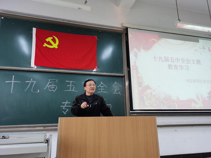 首先,经济系副主任杨健全教授带领全体党员学习了十九届五中全会公报,杨教授用形象生动的案例着重从国内外形势、战略布局、“十四五”期间遵循的原则、创新驱动发展战略、产学研结合等方面为全体党员进行了解读。杨健全教授还对电信系学生党员提出了宝贵意见,他指出“第一,学生党员应认真学习、体会公报精神,要力争做到思想上始终与党中央保持高度一致;第二,学生党员要认真践行公报精神,把它与自己的学习、工作和生活密切联系起来”。杨教授风趣幽默的讲话赢得现场阵阵掌声。