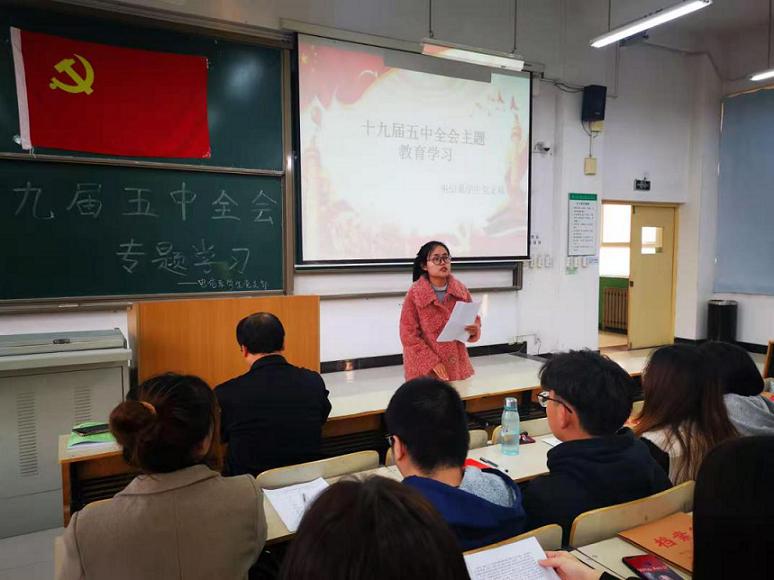 最后王姣老师进行了总结。她要求全体学生党员要把学习宣传贯彻党的十九届五中全会精神作为今后一个时期的重要任务,要通过三会一课、主题党日活动和“学习强国”等平台,采取集中研讨、辅导报告、心得分享等方式逐字逐句研读全会公报,全体党员应不断提高自己专业知识和科技创新能力,为我国全面建设社会主义现代化国家贡献青春力量。
