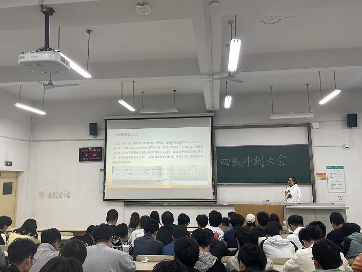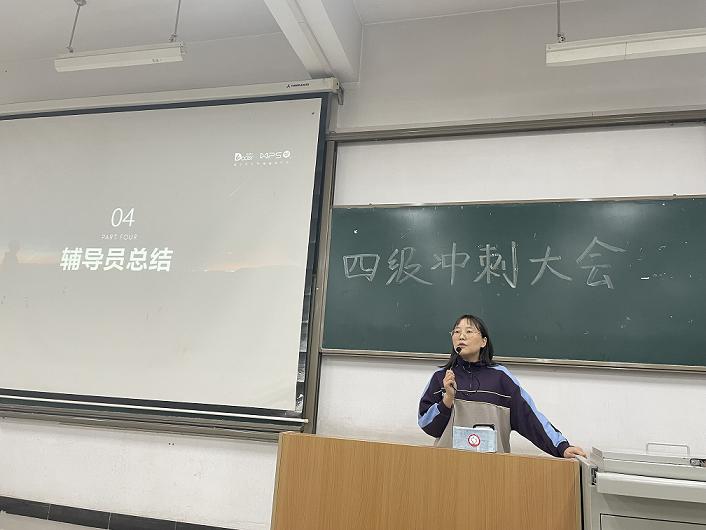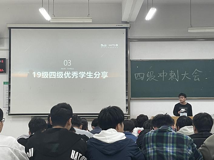 会议伊始,主持人张兴妮向大家介绍了四级考试的由来,让大家更清晰地认识到大学英语四级考试的重要性。大会第二项,由2020级优秀学生代表黄思绒、安麒颖、代鑫雨向大家展示自己如何备考英语四级,分享了他们的个人学习经验。他们在发言中向大家提出几点建议:1、要抓住课堂,有明确的时间规划。2、课后要及时复习巩固课堂知识,学会自学。3、当日事当日毕。大会第三项,2018级及2019级优秀学生代表赵敬伟和陈玟,给大家分享了自己通过四级的经验,为同学们的英语四级备考提供了宝贵的意见。最后,由辅导员张华老师总结本次大会,张华老师呼吁大家积极备考四级,诚信对待考试,并鼓励同学们一次性通过英语四级考试,并安排每周天晚自习完成一套英语四级真题。也希望大家摆正心态,用有效的方法策略去积极备考英语四级。