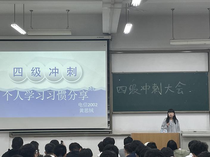 为了帮助学生找到学习英语的方法,提高英语水平,能顺利通过英语四级考试。西安交通大学城市学院电信系于2021年10月8日下午五点在教学楼E200教室举行英语四级备考动员大会。参与本次大会的有电信系辅导员张华老师、电信系2018级及2019级优秀学生代表、2020级全体学生。