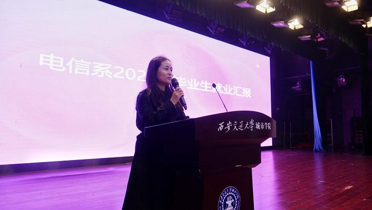 首先,由王姣老师汇报了2021届毕业生就业情况,并对学生考研和就业情况进行了分析。通过讲述往届毕业生的例子,她告诉同学们要做出正确地选择,并且全心全意地努力才能实现自己的梦想。