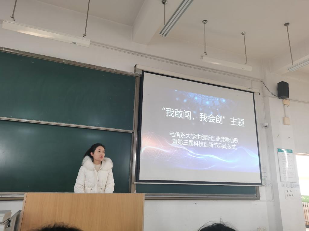 活动伊始,系学工负责人王姣总结了上年度电信系双创比赛的参赛与获奖情况,并对本年度竞赛的具体安排做一部署;接着,主任助理张建进行教师代表发言,他指出创新创业是促进大学生全面发展的重要平台,也促进了指导教师教学与科研的有机结合,大家要充分利活动契机把自己好的创意想法展示给别人,力争在交流中实现创新和科技成果转化;最后,电信系主任赵录怀进行总结,他强调创新创业大赛有效促进了双创人才培养质量的提升、学生创新创业精神的培育及教师教育观念的转变和教学能力的提高,希望同学们在大赛中学习新知识、汲取新思想,同时呼吁教师队伍要发挥主体意识和责任意识,共同努力创造更多的双创成果。