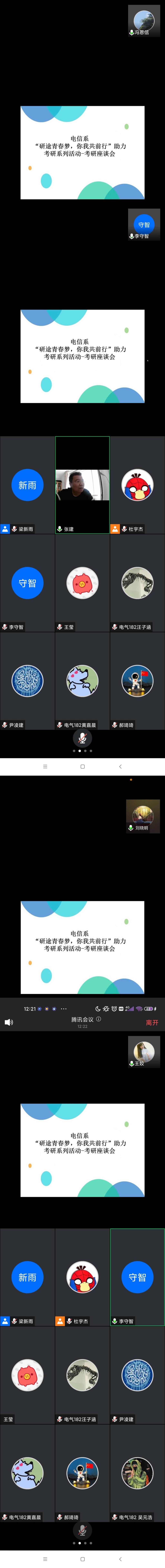 4月19日下午13时,电子信息工程及通信工程专业开展线上考研座谈会,会议由电信系副主任兼中兴学院院长冯恩信教授主持,主任助理刘晓明、学工负责人王姣、毕业班辅导员梁新雨、樊超、张华、2018级电信及通信专业考研学生共同参加。