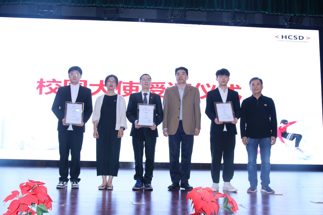HCSD作为华为云高校圈层品牌活动,自2022年推出以来,便在各大高校及学生开发者群体间引起热烈的反响。HCSD(Huawei Cloud Student Developers)即华为云学生开发者,是由校园大使为代表的学生开发者组织。在活动现场,西安交通大学城市学院副院长朱旭、院长助理张学堂、华为云高校生态运营总监宁利智共同为交大城市学院优秀校园大使王晨、王嘉梁、屈欣琪颁发荣誉证书,旨在通过榜样的力量,培养更多优秀的校园开发者。