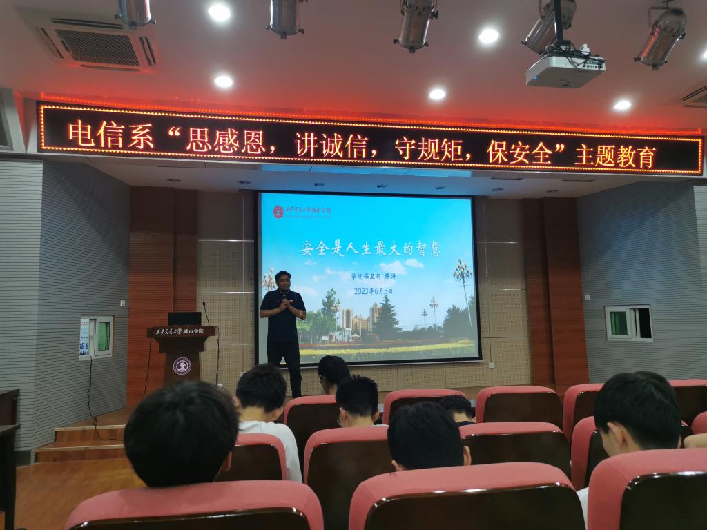 为增强大学生的诚信意识,提高大学生的综合素质,强化资助工作的育人成效,6月8日电信系在教学楼F100举办“思感恩,讲诚信,守规矩,保安全”主题教育的活动。邀请学院保卫部部长陈涛为学生进行预防电信网络诈骗和校园安全方面主题教育。电信系主任助理王姣、辅导员张华、马麒淇及大一至大三年级学生代表参加本次讲座。