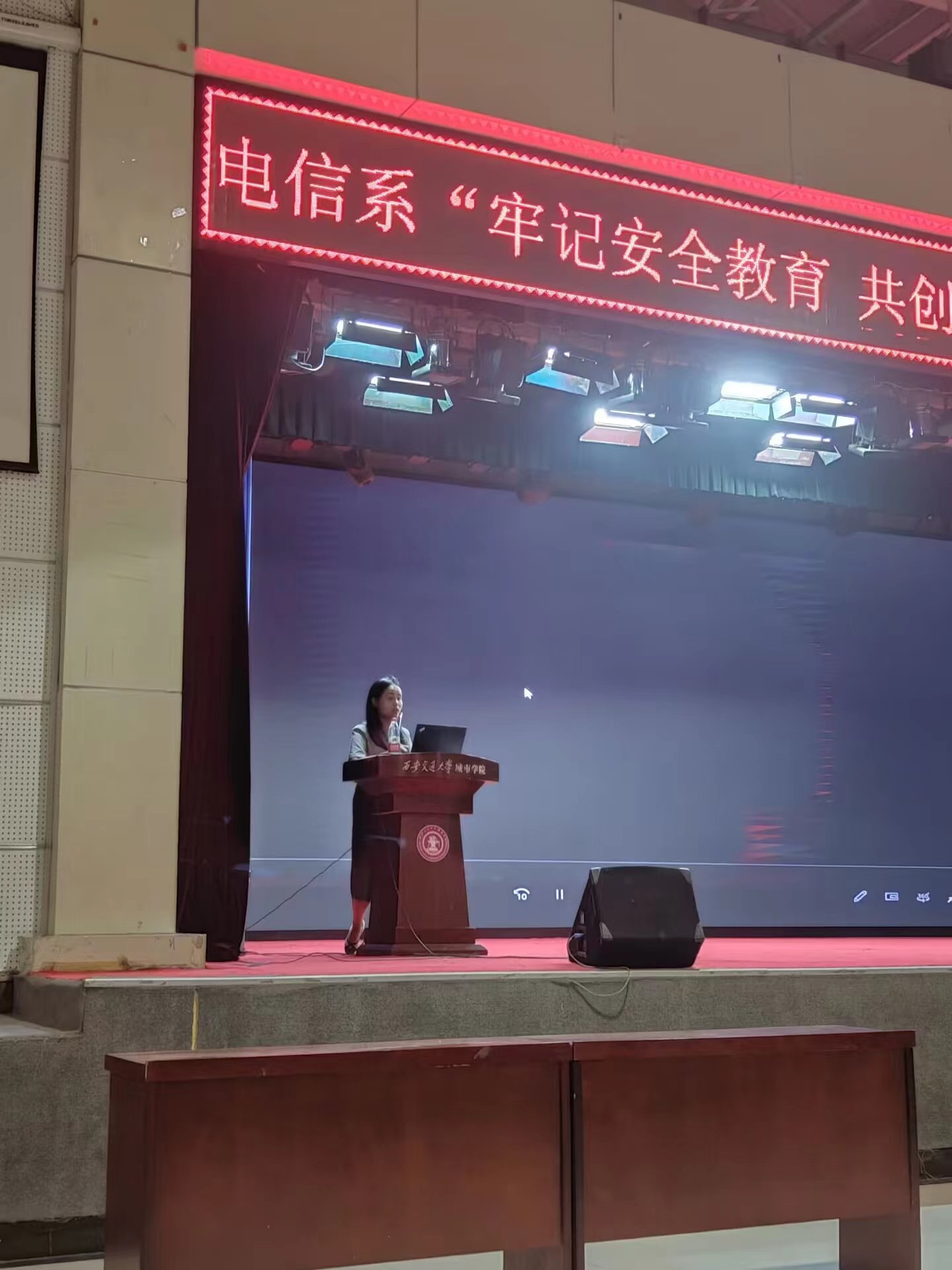 为帮助新生更好融入校园生活,提高政治素养、强化校园安全教育,电信系于2023年9月19日晚19时在大学生活动中心召开了“牢记安全教育 共创平安校园”主题教育暨党团知识启蒙教育活动,本次活动由学院保卫部部长陈涛、电信系主任助理王姣、团工委书记马麒淇主讲,活动由电信系辅导员马佳辰主持。