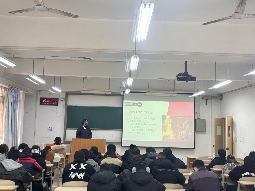 12月15日下午,在教学楼D107教室组织久久精品亚洲全体干部开展了以“宿舍安全隐患排查”为主题的班会,班会上,由学生干部吴双为到场学生在宿舍用电安全,防火安全等进行了详细讲解,并提醒大家在宿舍内不私拉电线、不使用大功率电器、注意饮水机用电安全、杜绝不规范用电等行为。最后,宿舍安全专员史甜甜对于走访宿舍检查情况进行通报,并结合身边的具体案例进一步加强学生干部们对于宿舍用电安全的认识,再次强调所有同学务必注意冬季宿舍防火防电安全。
