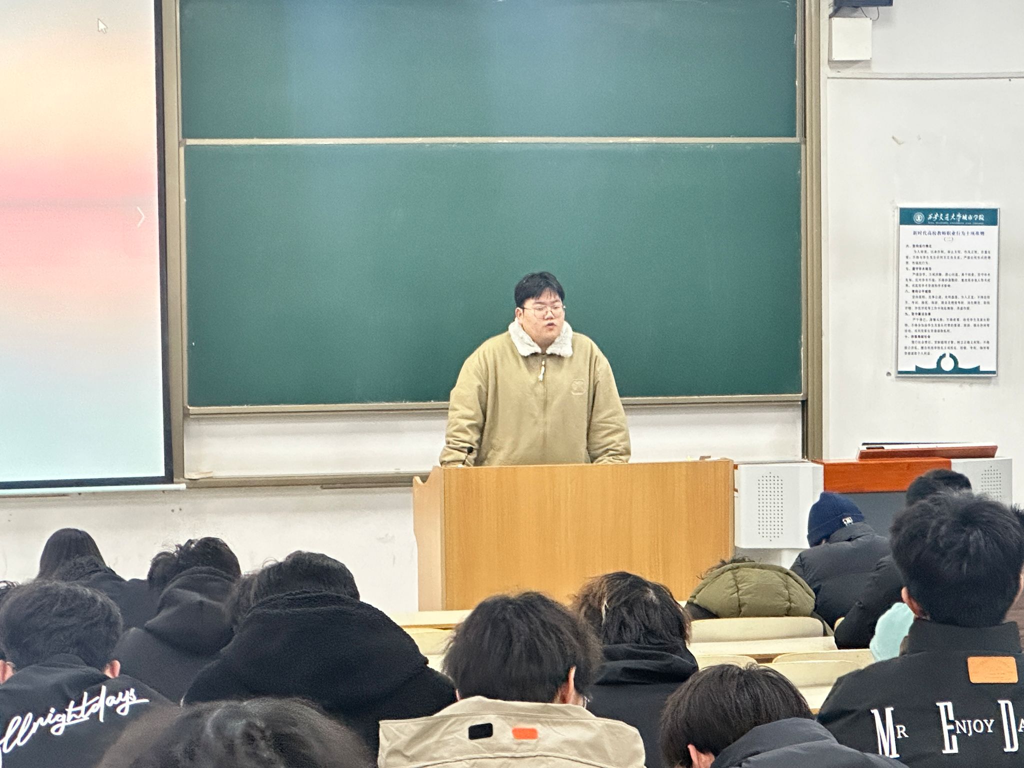 其次,着重强调了诚信考试的重要性,对考场规则、违纪处理细则进行讲解,希望同学们都能合理规划时间,认真备考,诚信应对考试,同时希望班委们能起到良好的带头作用,营造积极向上的班风学风。接着,围绕近期频发的电信诈骗案件提醒同学们保护好个人隐私与财产,提高防范意识和网络信息鉴别能力。最后,邀请到大四年级的杨泽远和李佳诚同学进行学习经验分享。两位学长从诚信应考、怎样合理规划复习时间以及各课程怎样备考等方面进行了分享,迎来了同学们的阵阵掌声。
