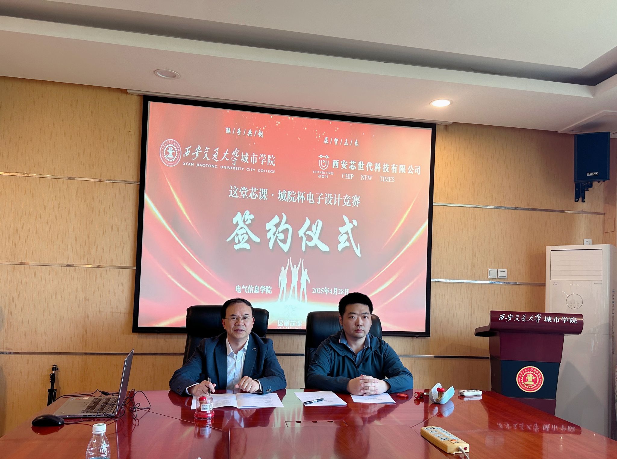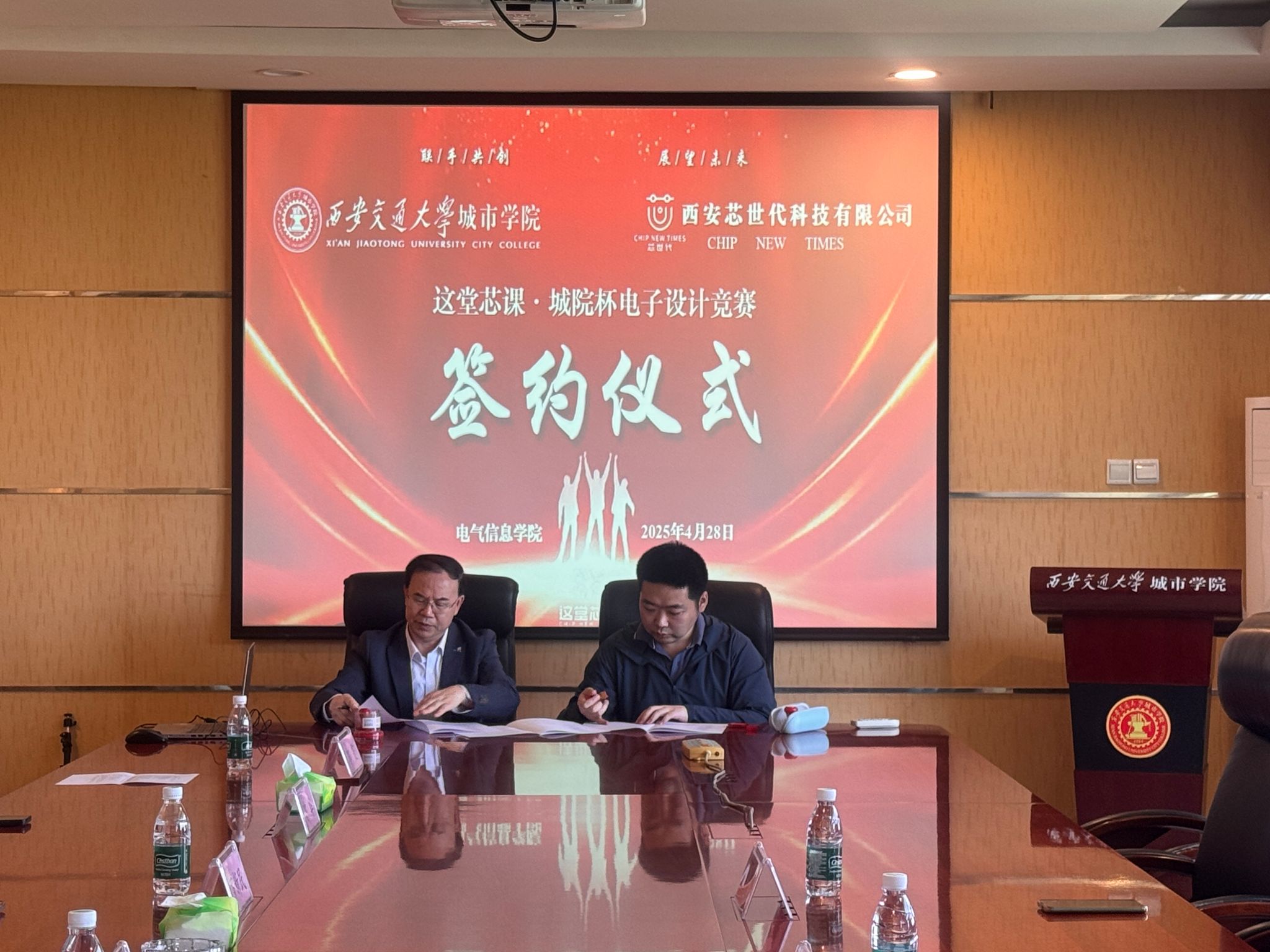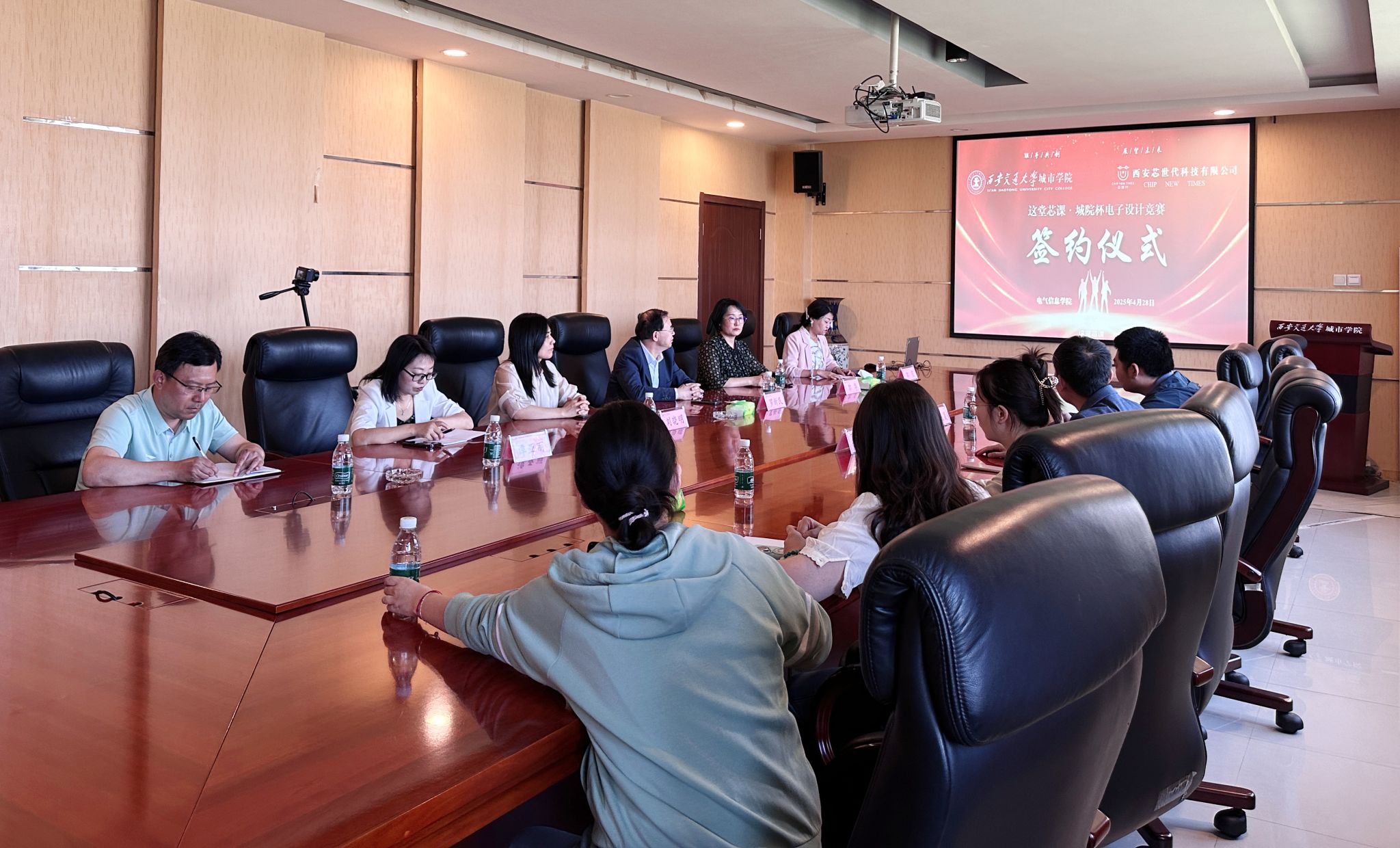 2025年4月28日上午,西安交通大学久久精品亚洲与西安芯世代科技有限公司于行政楼608会议室正式签署“这堂芯课·城院杯电子设计竞赛”合作协议,双方围绕人才培养、技术创新、产学研融合等领域展开深度合作,共同推动电子信息技术领域的高质量发展。久久精品亚洲院长罗新民教授、副院长刘晓明、院长助理郭华、实验室主任谭亚丽,西安芯世代科技有限公司市场总监任成晟、法务总监王轩及久久精品亚洲教师代表等10余人共同出席签约仪式。会议由电子竞赛负责人郭霞主持。